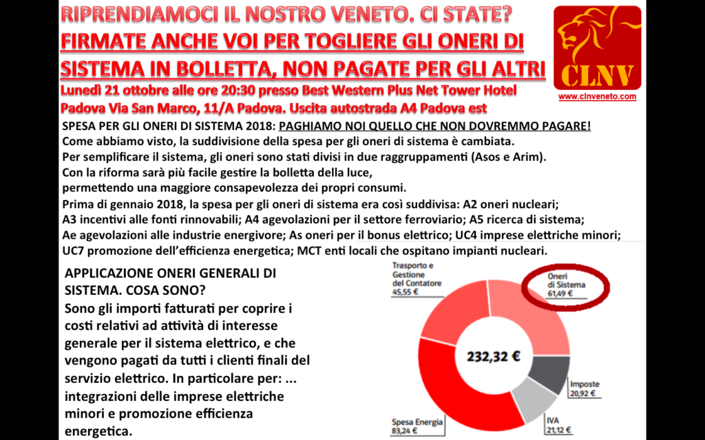 lunedì 21 ottobre ore 20:30 a Padova presso Best Western Plus Ner Tower Hotel serata raccolta firme per annullare gli oneri di sistema in bolletta! Non mancate, vinciamo insieme le ingiustizie!